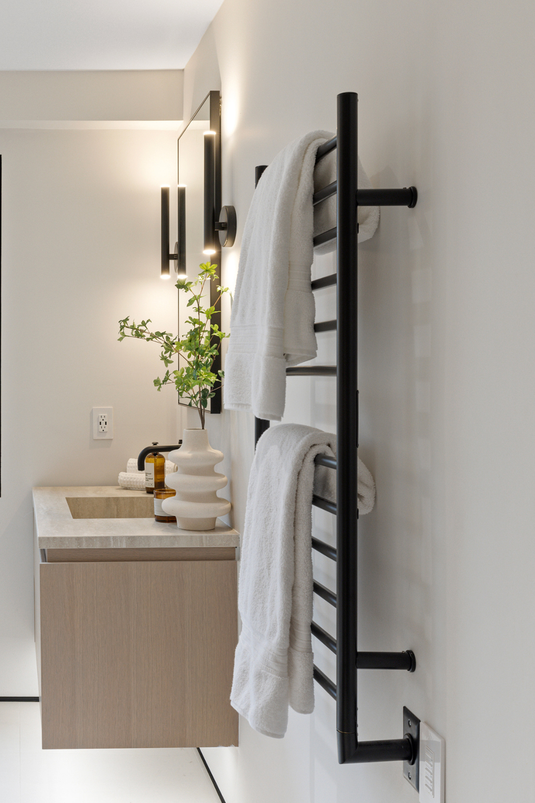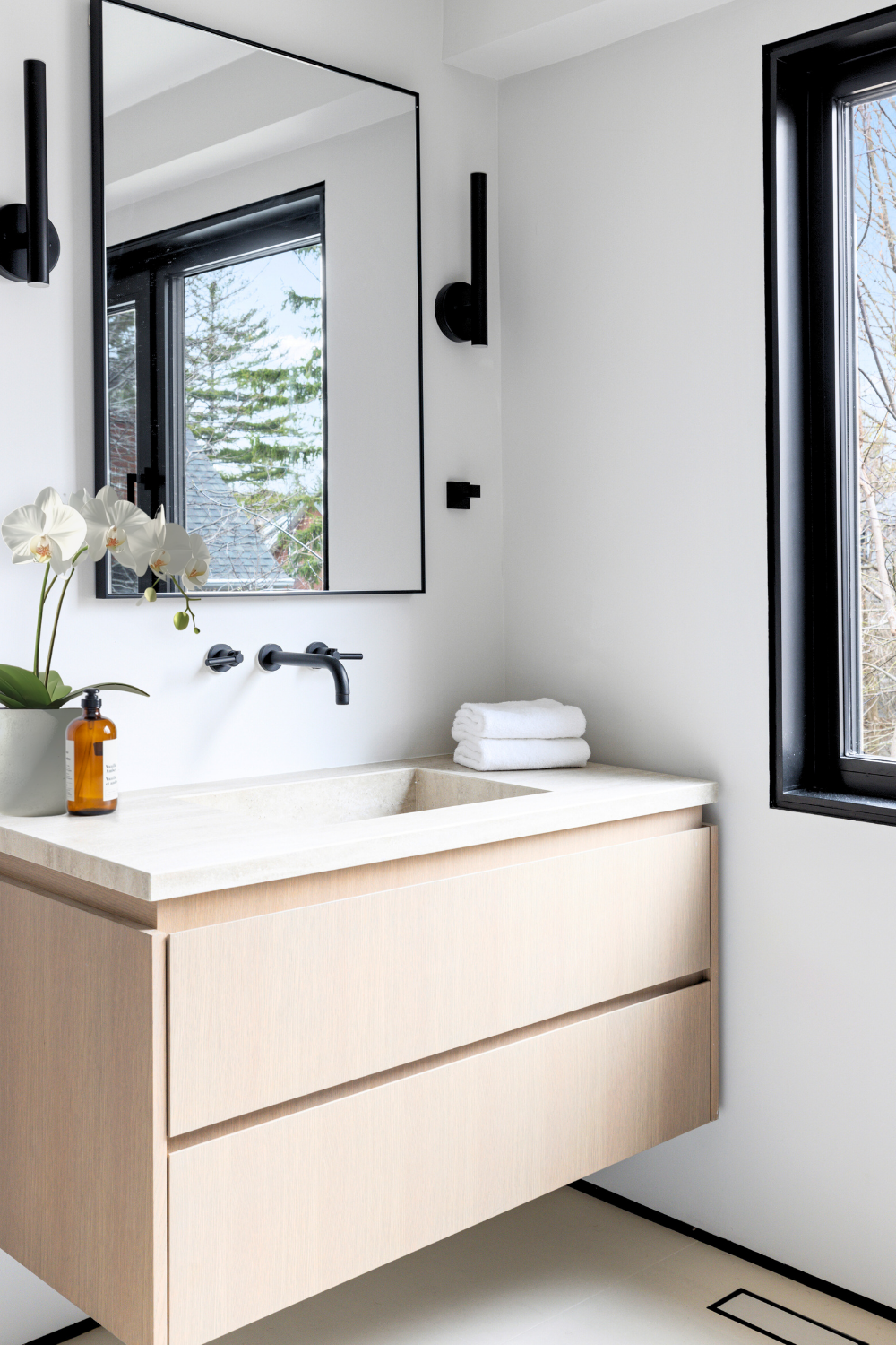 A floating white oak vanity adds: