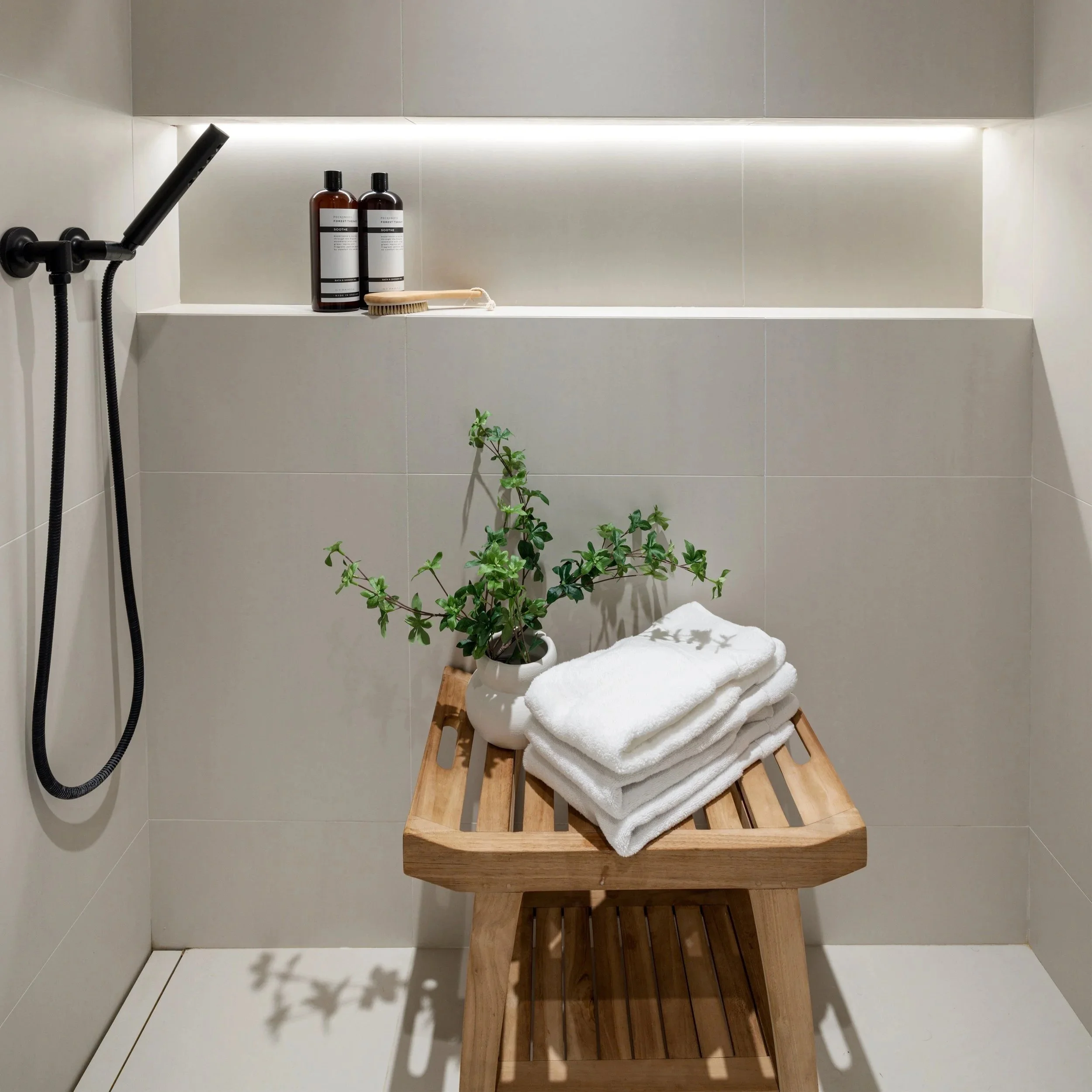 A simple addition that transforms the shower? A teak shower bench.