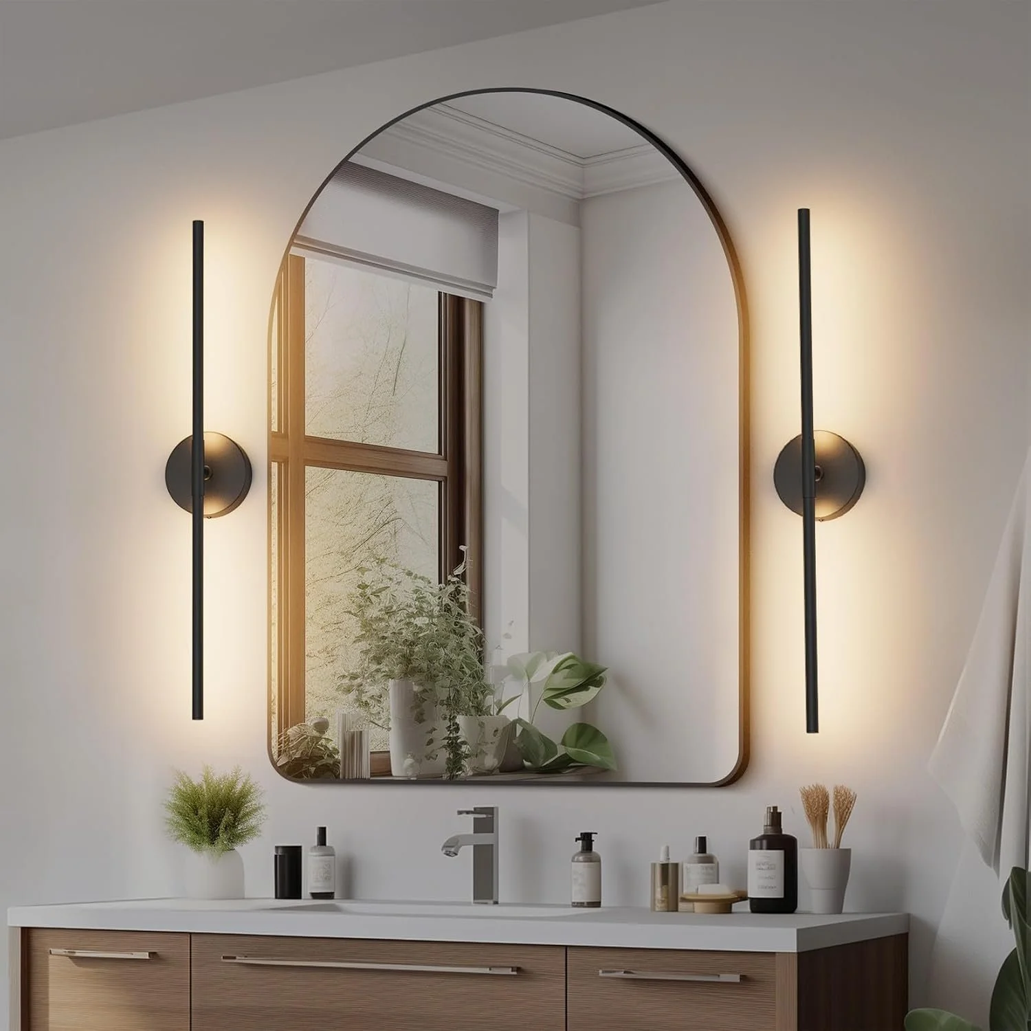 A black metal framed vanity mirror creates contrast against soft neutral walls, while modern matte black wall sconces provide flattering, layered lighting.